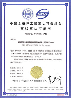 【本報訊】2012年3月27日,福建潯興拉鏈科技股份有限公司測試中心順利通過CNAS實驗室現場評審和資質評定,成功獲得CNAS實驗室認可證書,證書編號為No.CNASL5571。潯興測試中心從此躋身國家級實驗室行列,這是繼高新技術企業、國家級企業技術中心、國家專利工作交流站、全國企事業知識產權示范創建單位之后,潯興股份再次榮獲的國家級榮譽。至今,潯興是中國拉鏈行業唯一一家擁有國家級實驗室的企業。