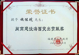 【本報(bào)訊】6月17日,第四屆世界閩商大會在福州舉行。會上,福建省人民政府為238位非公有制經(jīng)濟(jì)人士頒發(fā)了“閩商建設(shè)海西突出貢獻(xiàn)獎(jiǎng)”,我司施能坑董事長榮膺該項(xiàng)殊榮。